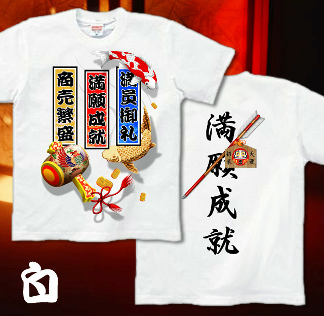 三枚の千社札、打ち出の小槌、小判、錦鯉と金色の鯉と、めでたい要素満載、背面には破魔矢という賑やかさ☆参拝お参り、居酒屋さんの正月始めのTシャツにもピッタリのデザインです♪千社札の内容もカスタマイズ頂ける為、世界で一枚だけのTシャツを作れます!