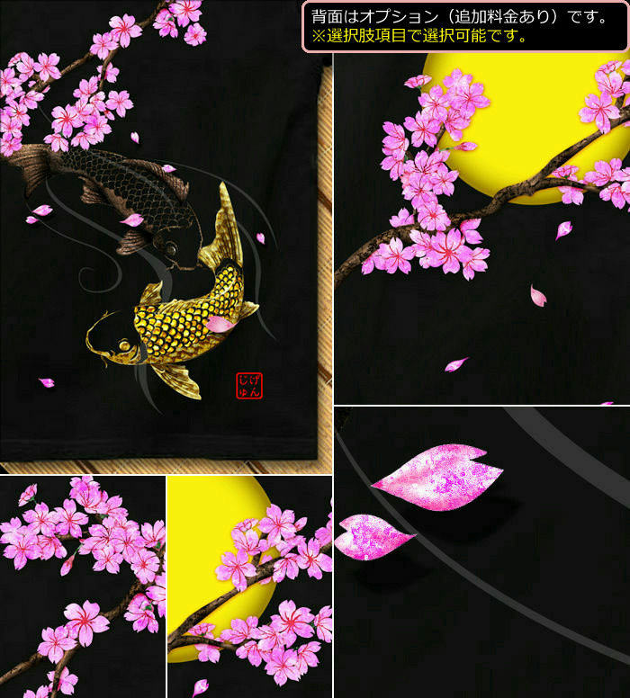 • ★鯉と桜が美麗な和柄Tシャツ★Genju が出す和柄の後には草木も生えない (悪い意味で) と有名な今日この頃、皆様如何お過ごしでしょうか。さんざん方々から和柄Tシャツ要望の突き上げをくらい、和柄のつもりで公開したTシャツは「和柄に見えない」と一言で無かったことにされる中、苦悩と試行錯誤を重ねて、はや二年。(遠い目)ようやく最近、胸を張って言えるようになりました。和柄?なにそれ、おいしい?(*´∀`)