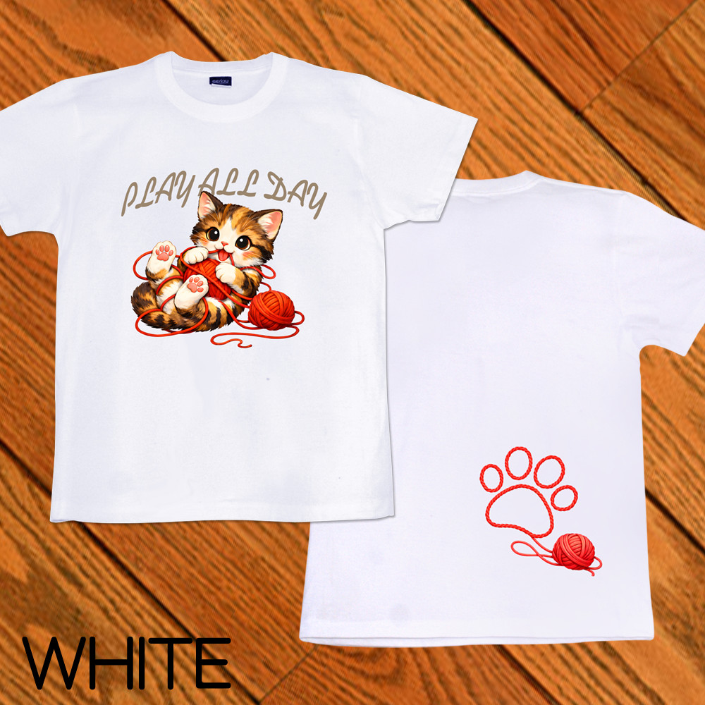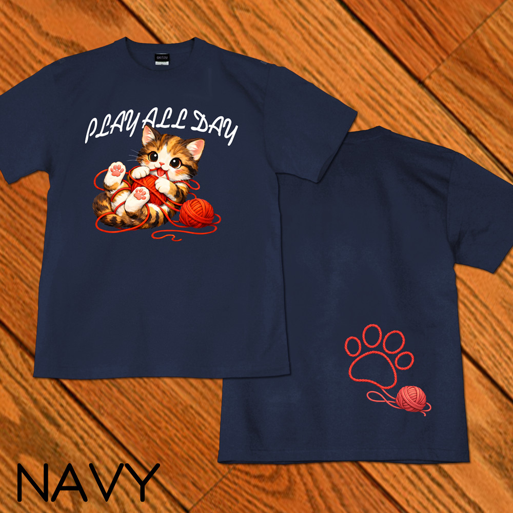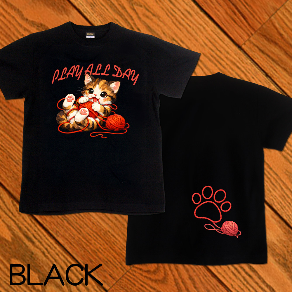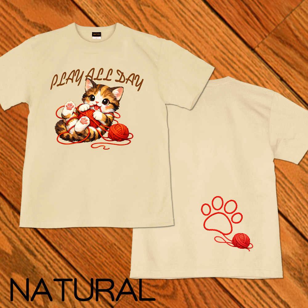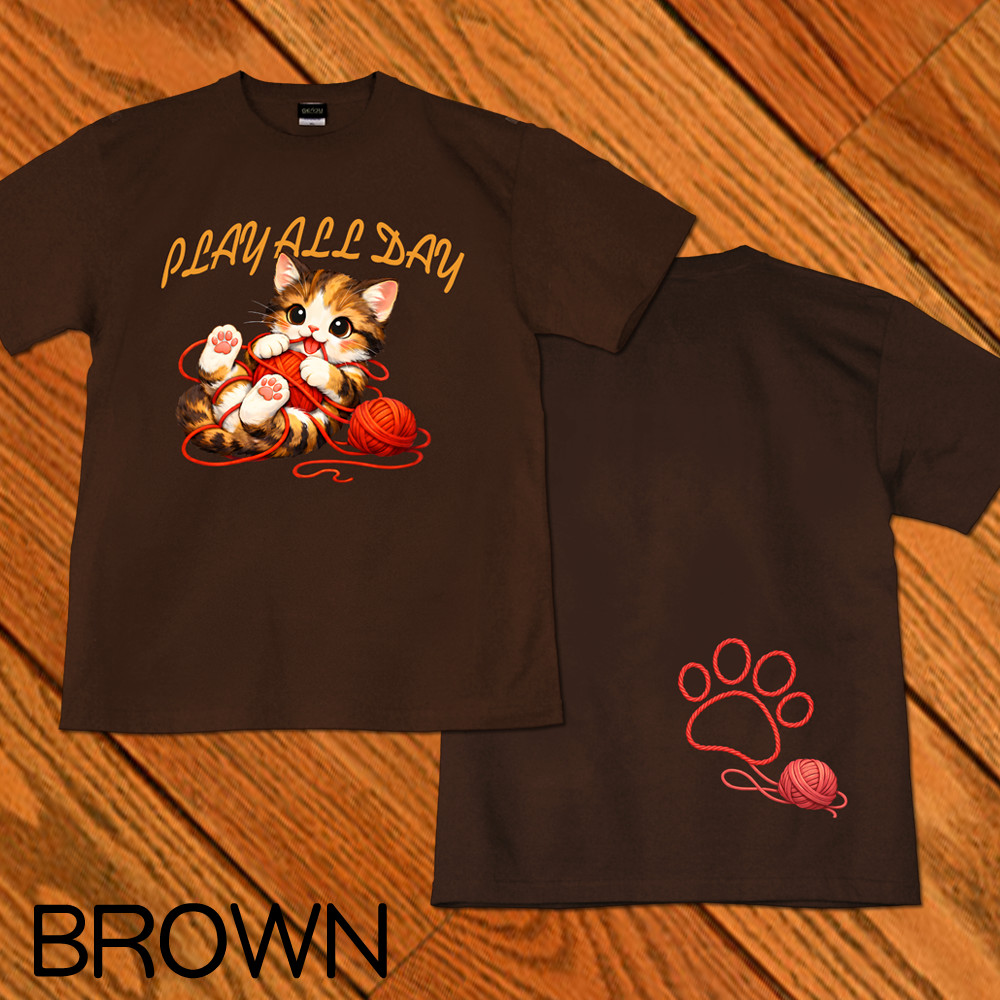 GENJU 可愛い猫 Cat キャット にくきゅう 毛糸 キュート 茶トラ メンズ レディース Tシャツ 半袖 長袖 PLAY ALL DAY 大きめサイズあり XXL XXXL 2L 3L 4L