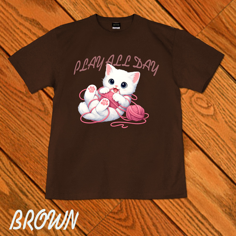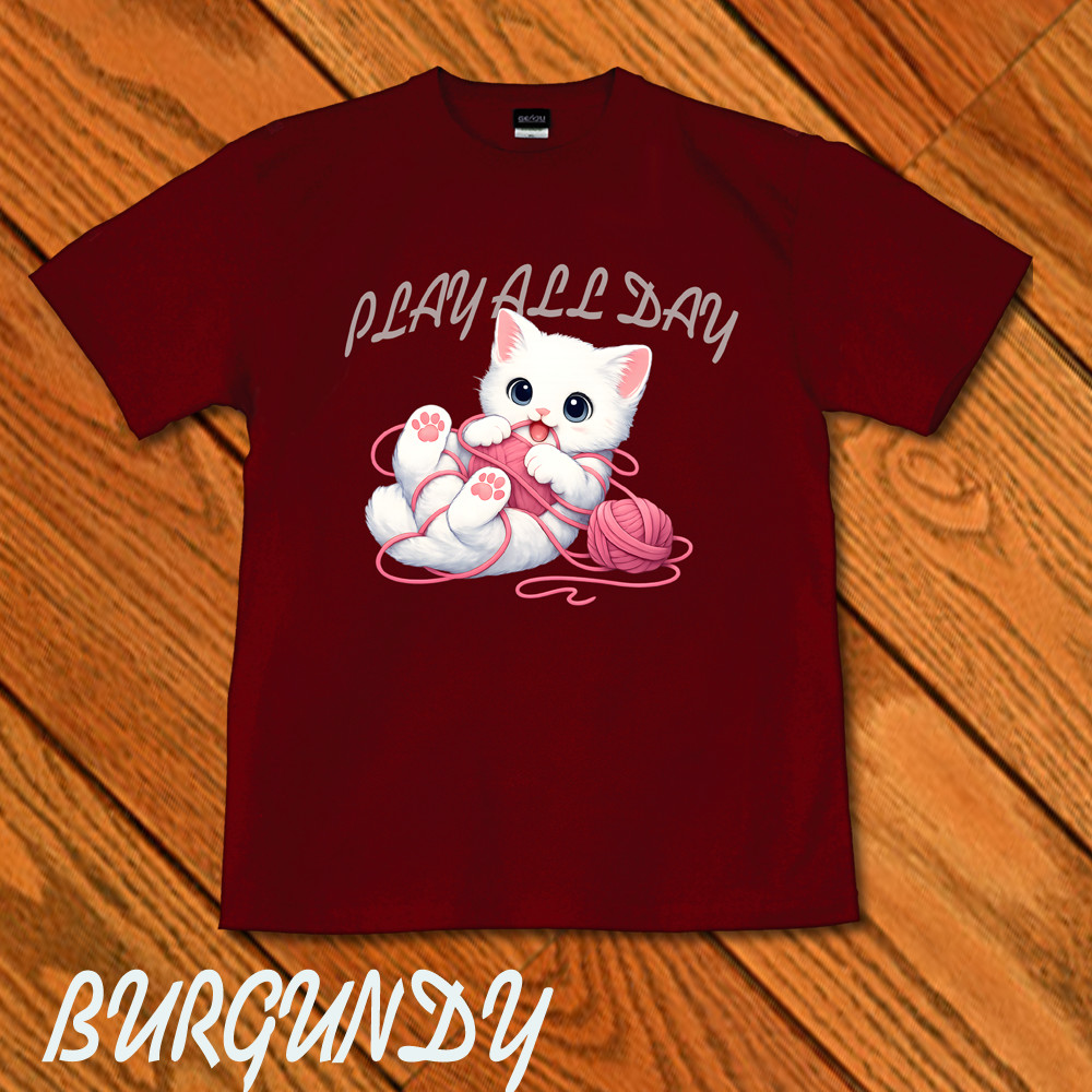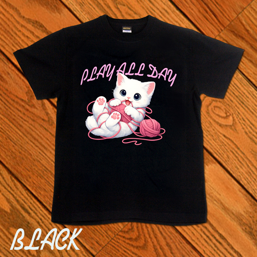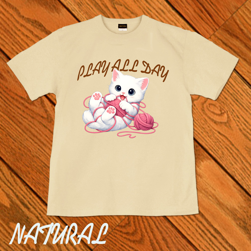 GENJU 可愛い猫 Cat キャット にくきゅう 毛糸 キュート 白猫 メンズ レディース Tシャツ 半袖 長袖 PLAY ALL DAY -白猫- 大きめサイズあり XXL XXXL 2L 3L 4L