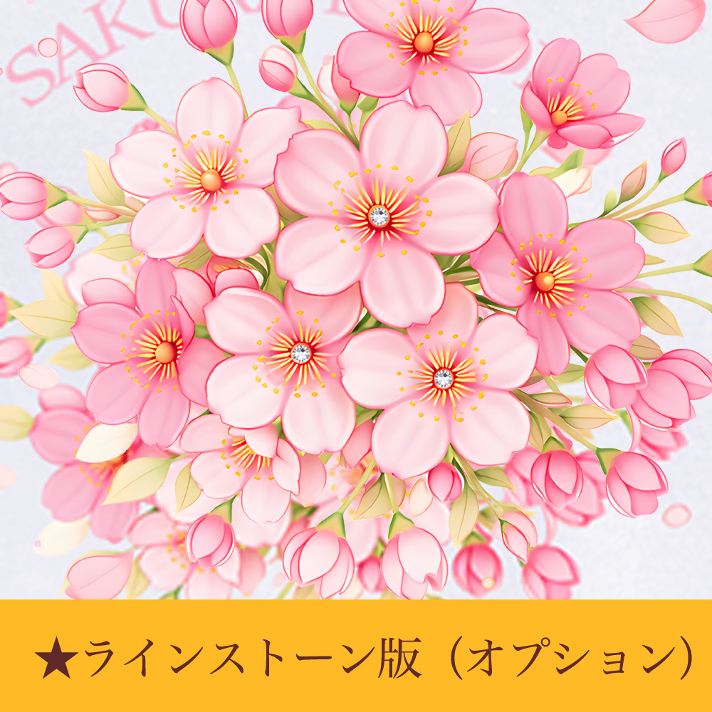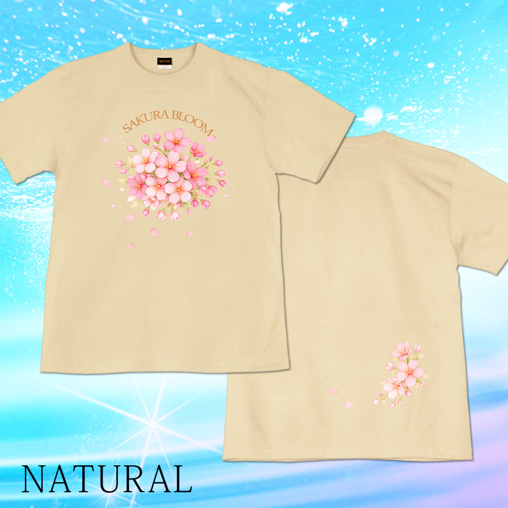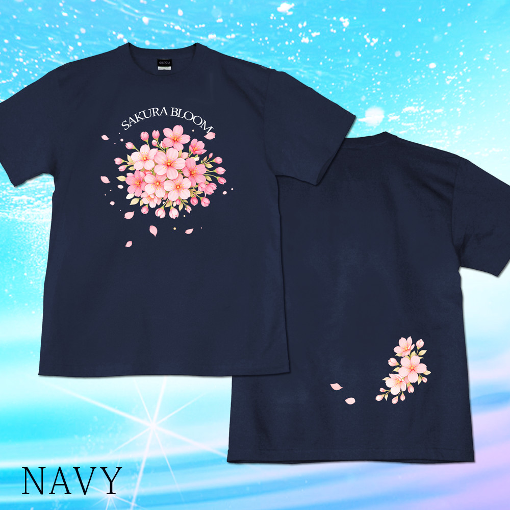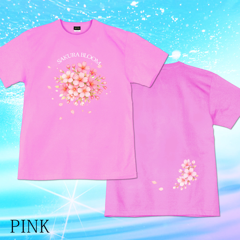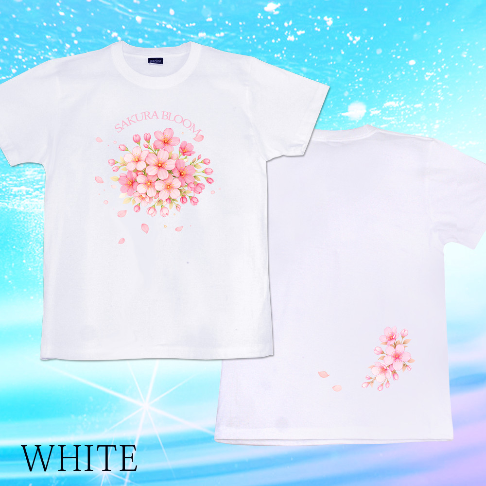 見目麗しい桜のデザインTシャツ。ブーケのような雰囲気でまとまりも良く、オプションになりますが、ラインストーン(スパンコール)を付けて豪華な雰囲気にするのも魅力的!