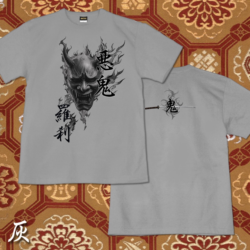 ゆらめく炎の中に浮かび上がる般若の面。そして同じく炎を揺らめかせる悪鬼羅刹の文字自体が違和感なく組み込まれており、たまらなくクール。GENJUブランドらしい和柄モチーフとアメカジデザインが融合した1枚だ。背面の日本刀とトライバルの組み合わせもシンボリックで違和感なく魅力を高めている。